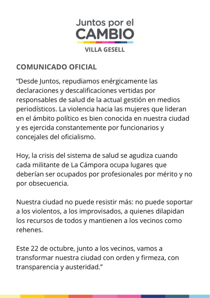 Juntos por el Cambio emitió un comunicado condenando los dichos por parte de personal del área de salud en contra de la candidata a Intendente Clarisa Armando, repudiando la violencia contra las mujeres en la política.