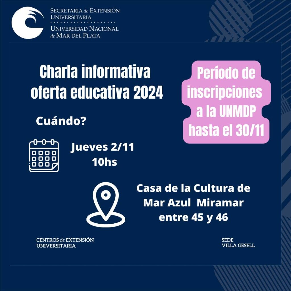 Centro de Extensión Universitaria del Partido de Villa Gesell dará una charla informativa sobre oferta educativa de la UNMDP para carreras, presenciales y a distancia.La inscripción a la UNMDP se puede realizar hasta el 30 de noviembre.