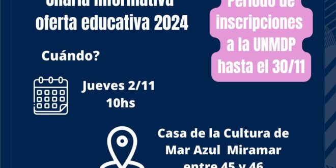 Charla informativa sobre oferta educativa de la UNMDP el día Jueves 2 de noviembre a las 10 hs en la Casa de la Cultura de Mar Azul