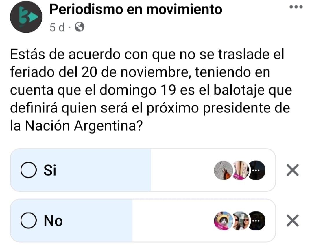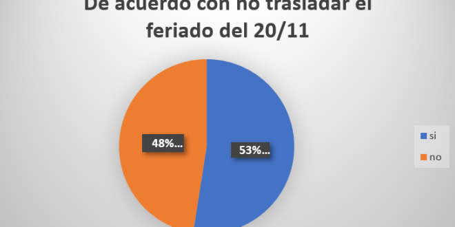Hace unos días atrás, cuando estaba en duda si el feriado por el Día de la Soberanía se trasladaría o no, debido a que la votación del balotaje presidencial será el domingo 19, realizamos una encuesta consultando: «Estás de acuerdo con que no se traslade el feriado del 20 de noviembre, teniendo en cuenta que el domingo 19 es el balotaje que definirá quien será el próximo presidente de la Nación Argentina?» Un 53% dijo estar de acuerdo en no mover el feriado y un 48% contestó que no estaba de acuerdo en no cambiar la fecha. Resultado muy peleado, así como se avista la elección para elegir el próximo presidente argentino entre Javier Milei y Sergio Massa.