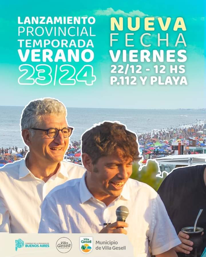«Por el temporal, el lanzamiento de la Temporada se pasó para este viernes. Será la primera vez que esta apertura sea en Villa Gesell y con la presencia del Gobernador. Los espero a todos para disfrutarlo y seguir trabajando juntos para posicionarnos como el mejor destino turístico del país», expresó en sus redes sociales el mandatario geselino. El acto será el viernes 22 de diciembre a las 12 del mediodía en playa y Paseo 112.