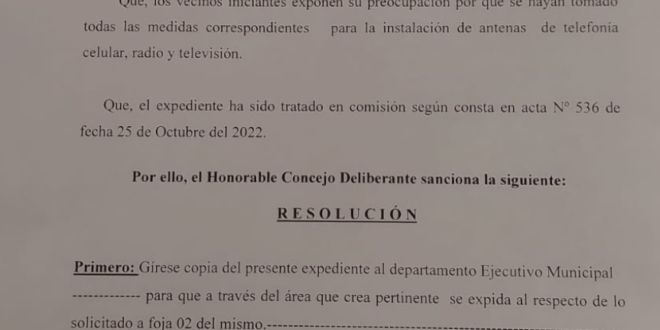 El expediente es el N° V-14594/22 en el que el Concejo Deliberante de Villa Gesell le solicita al intendente Gustavo Barrera que responda el pedido de información que los vecinos preocupados por los daños que consideran que ocasiona la tecnología 5G, fue girado en noviembre de 2022 y aún no hubo ninguna contestación al respecto.