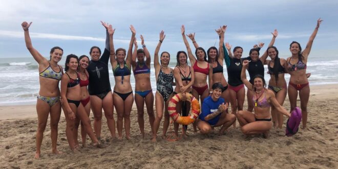 8.20 de la mañana y Periodismo en Movimiento llega a la playa donde ya se encontraban reunidas 17 guardavidas para iniciar la ceremonia de reconocimiento a Matilve Ontivero primer guardavida mujer en Villa Gesell y de las propias trabajadoras que insisten en cosntruir una playa inclusiva, con equidad y perspectiva de género. Luego de un disrcuso donde no solo se pide por igualdad, en el dircurso se pone de manifiesto el temor por el contexto de retroseso frente a los años de avance en materia de derecho de genéro, «donde nos quieren acallar y arrebatar conquistas históricas como son La ESI, la Ley Micaela «