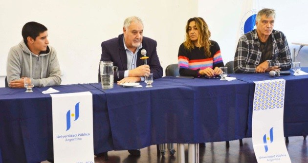 En la conferencia de prensa realizada este lunes en el Aula Magna»Silvia Filler» del Rectorado, el rector, Alfredo Lazzeretti; junto a Pedro Sanllorenti, titular de la Agremiación Docente Universitaria Marplatense (ADUM), Victoria Schadwill de la Asociación del Personal de la UNMDP (APU), e Iván Vivas, de la Federación Universitaria Marplatense (FUM); brindaron detalles de la convocatoria.
