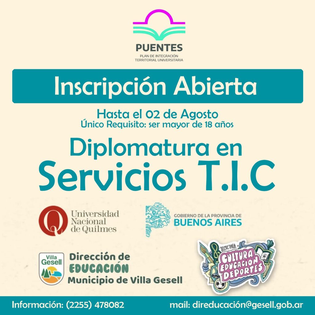 Se encuentra abierta la inscripción a la Diplomatura en Servicios TIC de la Universidad Nacional de Quilmes. Las y los interesados podrán inscribirse hasta el 2 de agosto y solo necesitan ser mayores de 18 años. Para más información, comunicate al (02255)478082 o al direducación@gesell.gob.ar.