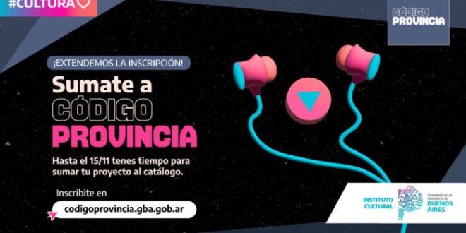 El Instituto Cultural bonaerense anuncia la extensión de inscripciones al catálogo Código Provincia. La convocatoria estará abierta hasta el 15 de noviembre, el registro se podrá realizar de manera online y gratuita a través de la página web del programa. Se trata de una plataforma que funciona como un banco de música creada y producida en la provincia de Buenos Aires, da cuenta de la diversidad territorial y cultural bonaerense con un catálogo de artistas, playlists, producciones radiales, contenidos para medios electrónicos, conciertos, y presencia en festivales.