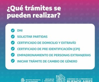 Serán tres jornadas en distintos puntos del Partido, donde se podrán realizar los siguientes trámites: DNI, solicitar partidas, certificado de domicilio y extravío, certificado de pre identificación (CPI), empadronamiento de personas extranjeras e iniciar trámite de cambio de género.