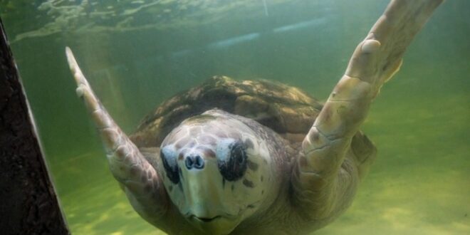 Es que Jorge es un ejemplar de aguas cálidas, nacido en la costa de Brasil; cuando fue rescatado se lo identificó como de la especie Caretta-Caretta, o cabezona, una tortuga tropical común en mares cálidos, migratoria y cosmopolita en océanos templados y subtropicales.