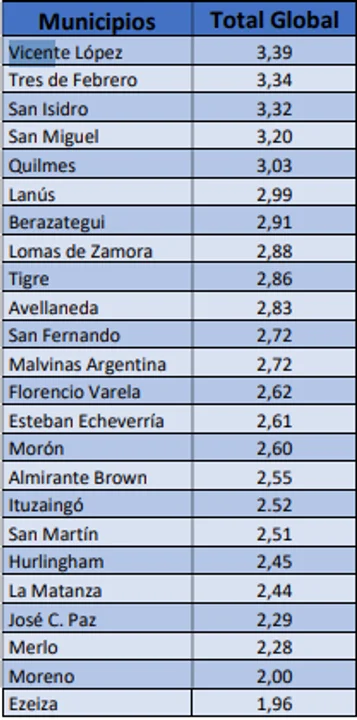 El ranking es liderado por Vicente López, con una puntuación de 3,39; seguida por Tres de Febrero (3,34), San Isidro (3,32), San Miguel (3,20) y Quilmes (3,03).