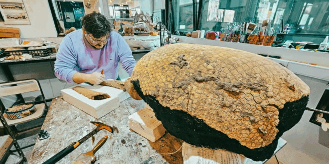 Se trata del gliptodonte Neosclerocalyptus paskoensis que tiene la particularidad de osificar sus cartílagos nasales y cornetes, los que fueron recuperados excepcionalmente en este hallazgo.