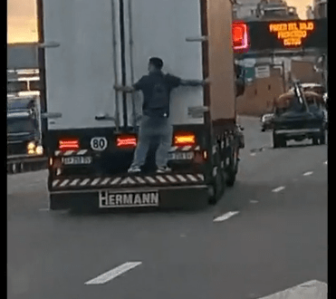 Un joven fue grabado mientras viajaba colgado de un camión en la autopista 25 de Mayo, sentido a la autopista Buenos Aires-La Plata.