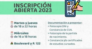 Se informa a la comunidad que están abiertas las inscripciones para comenzar o finalizar los estudios secundarios. Aquellas y aquellos interesados podrán inscribirse los martes y jueves de 18 a 22 horas y el miércoles de 16 a 18 horas en Av. Boulevard y Paseo 122. Para hacerlo, deberán presentar fotocopia de DNI y constancia de CUIL, fotocopia de partida …