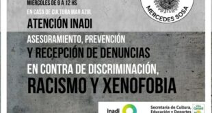 La atención de la delegada del INADI estará presente el miércoles 17 de agosto desde las 9 horas en la Casa de la Cultura “Mercedes Sosa”. El Instituto Nacional contra la Discriminación, la Xenofobia y el Racismo realizará una jornada de asesoramiento, prevención y recepción de denuncias este miércoles desde las 9 hs. en la Casa de la Cultura de …