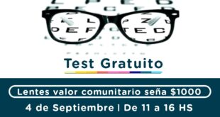 Este sábado 4 de septiembre se realizará una jornada oftalmológica en el local del partido vecinal CREAR, conducido por Hernán Luna y Jesica Cané. La jornada tiene como objetivo poder brindar a la comunidad la posibilidad de realizar una consulta oftalmológica gratuita y la confección de lentes recetados al costo (el valor es de 2900$ en adelante según patología y …