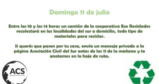En la jornada de hoy entre las 11 y las 14 horas aproximadamente, la cooperativa geselina Eco Reciclados hará retiros de materiales reciclables a domicilio. La iniciativa, impulsada por la Asociación Civil del Sur, que representa a vecinos de Mar Azul, Las Gaviotas, Mar de las Pampas y Colonia Marina, tiene como objetivo facilitar por medio de esta acción, el …