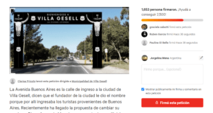 Más de 1600 vecinos desde ayer firmaron la petición realizada en la plataforma Change.org para que no se modifique el nombre a la Avenida central de ingreso a Villa Gesell, después de enterarse que un proyecto de ordenanza del bloque oficialista busca rebautizar a la arteria que nace en Ruta 11 como Diego Armando Maradona. Al darse a conocer la …