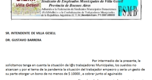 Por medio de un escrito los representantes de un sector de los trabajadores, le solicitan al intendente Gustavo Barrera que tenga en cuenta la situación de los trabajadores Municipales, que los sueldos no alcanzan y por la pandemia la situación del trabajador empeoró, por eso sería un gesto de su parte otorgar un bono de no menos de $ 10.000 …