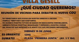 Los vecinos autoconvocados que no se quieren quedar afuera del debate del proyecto que el intendente Gustavo Barrera envió al Concejo Deliberante para modificar el Código de Ordenamiento Urbano y Territorial de Villa Gesell, se verán las caras nuevamente el viernes 20 a las 12 en la Plaza Primera Junta. Se preguntan Qué ciudad queremos? Porque consideran que «es un …