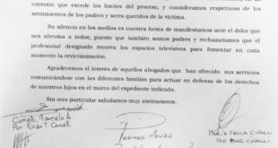 Las familias de los diez jovenes imputados por el crimen de Fernando Báez Sosa rompieron el silencio en texto firmado por todos, en el que defendieron la tarea del letrado Hugo Tomei y cuestionaron a los colegas que hablan del caso en los medios. “Ante las reiteradas e insistentes manifestaciones públicas en los diferentes medios masivos de comunicación por profesionales …