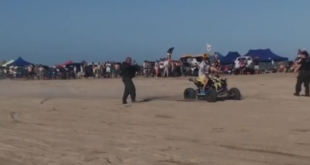 Sucedió esta tarde en la playa del Circuito Municipal a metros de donde se corre el Enduro del Verano. En las imágenes se ve al agente de la fuerza especial que es parte del operativo de seguridad dispuesto para la zona de acampe, tirarle con un arma que hace ruido y es para disuadir, no lastima, a un conductor de …