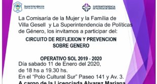 El Circuito de Reflexión y Prevención sobre Género se realizará este sábado 11 de enero de 18 a 19:30 horas en el Polo Cultural Sur de Villa Gesell y es organizado por la dependencia policial temática y la Superintendencia de Políticas de Género. La Licenciada Mariana Alvarez será la expositora. El encuentro sobre una temática muy importante como lo es …