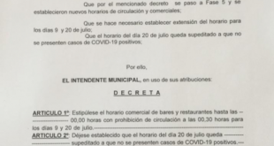El Intendente Municipal Gustavo Barrera anunció que el próximo jueves 9 de julio, feriado nacional en el marco del 204º aniversario de la Declaración de la Independencia Argentina, se amplía el horario comercial para los establecimientos gastronómicos hasta las 00 horas. De esta forma, y en consecuencia del fin de semana largo sin fines turísticos por la pandemia del COVID-19, …
