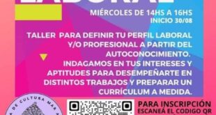 La Municipalidad de Villa Gesell invita a la comunidad a participar de un taller de apoyo para la inserción laboral. El curso tiene como objetivo brindar herramientas a los y las participantes que les permitan definir su perfil laboral o profesional a partir del autoconocimiento. El taller comienza el 30 de agosto en el horario de 14 a 16 hs A …