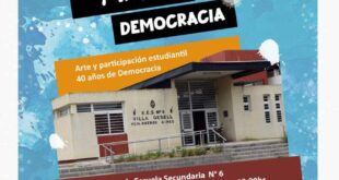 Comenzó «Pinta Democracia»: arte y participación estudiantil. Se trata de una propuesta artística para conmemorar el 40 aniversario de nuestra democracia. La institución elegida para hacer el mural es la Escuela Secundaria N° 6. Cuerpo docente, centro de estudiantes y delegados desarrollarán la pintura. En Villa Gesell la Escuela Secundaria 6 fue la elegida, el mural se realizará el próximo …