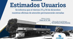 La Cooperativa Eléctrica de Villa Gesell informa que sus oficinas administrativas se mantendrán cerradas el 23 y el 30 de Diciembre debido a las festividades. Ambos días la Guardia de reclamos funcionará con normalidad.